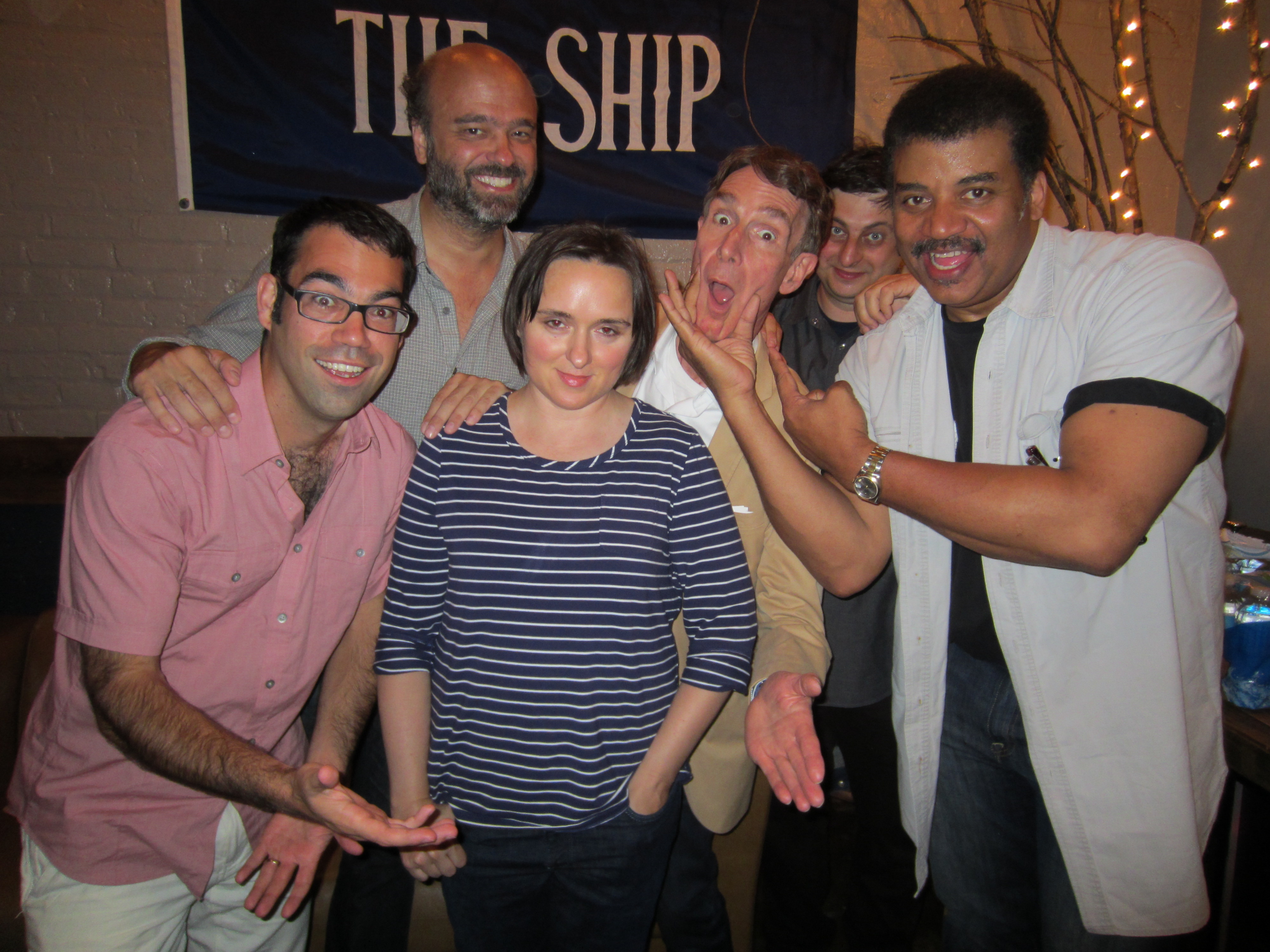 Backstage at The Particle Party! Left to Right: Kyle Cranmer, Scott Adsit, Sarah Vowell, Bill Nye, Eugene Mirman, Neil deGrasse Tyson. Credit: Leslie Mullen.