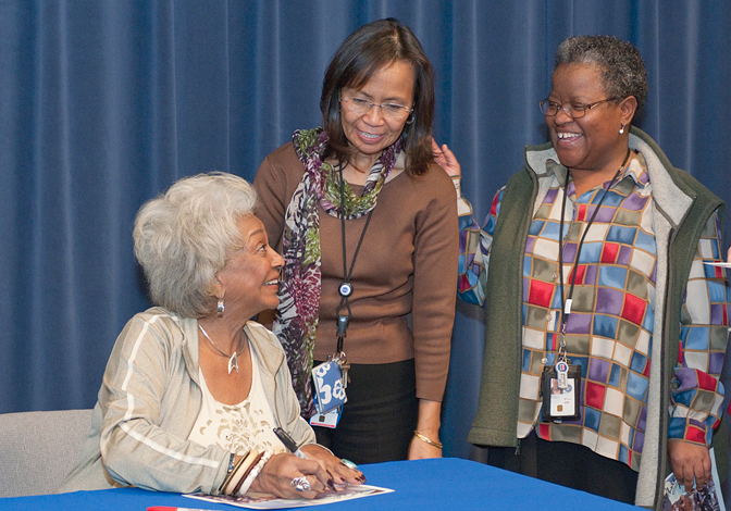Nichelle Nichols signing autographs for Dryden’s Gwen Young, Louise Boyd and scores of other Dryden employees during her visit and tour of NASA’s Dryden Flight Research Center at Edwards and the Dryden Aircraft Operations Facility in Palmdale Jan. 10, 2012. (NASA / Tom Tschida)
