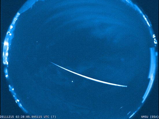 Geminid over southern New Mexico, Dec. 14, 2011. Moving at 80,000 mph the ¾” meteor flared brighter than the planet Venus before burning up, according to NASA.